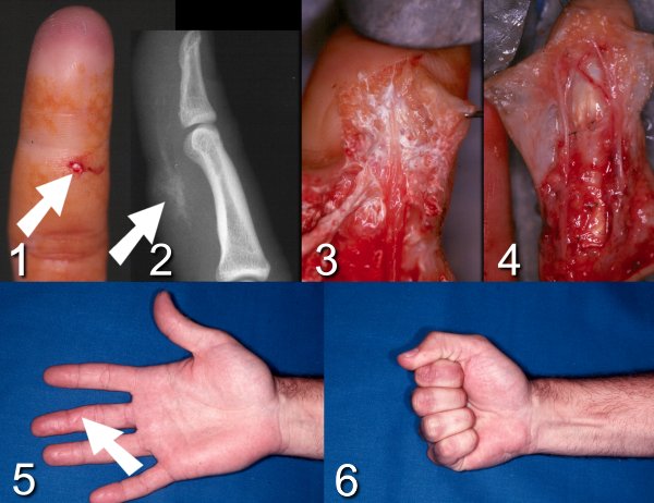 injury of the middle finger with a small entrance wound (1). Titanium