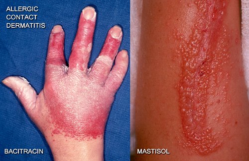 Left: dermatitis developing from bacitracin used to treat a superficial