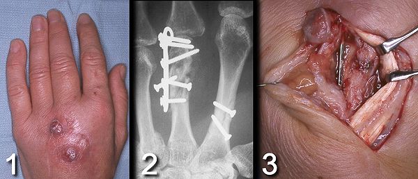 Figure Legend: Osteomyelitis is uncommon in the hand, usually requiring the combination of severe contamination and crush injury as in this patient who was kicked by a horse and developed osteomyelitis after being treated for open metacarpal fractures.