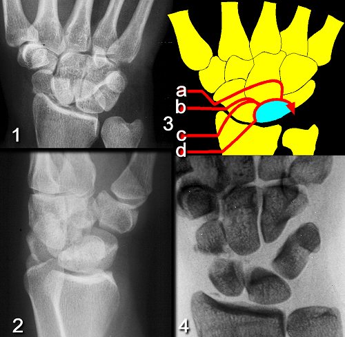 transcapitate perilunate fracture-dislocation (3a), transscaphoid perilunate