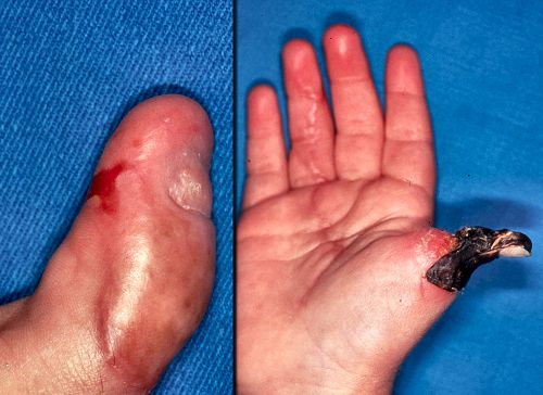 Figure Legend: Digital replantation may fail in part due to damage from long periods of ischemia (left), or more commonly fail completely because of inability to maintain revascularization (right).