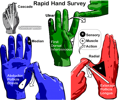 and radial (dorsal first web space / extensor pollicis longus) nerves.