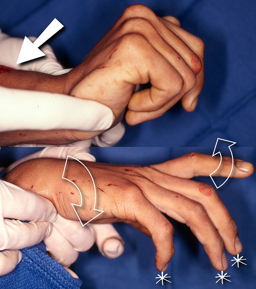 (asterixes), which had incomplete extension with passive wrist flexion. This was confirmed in the operating room.