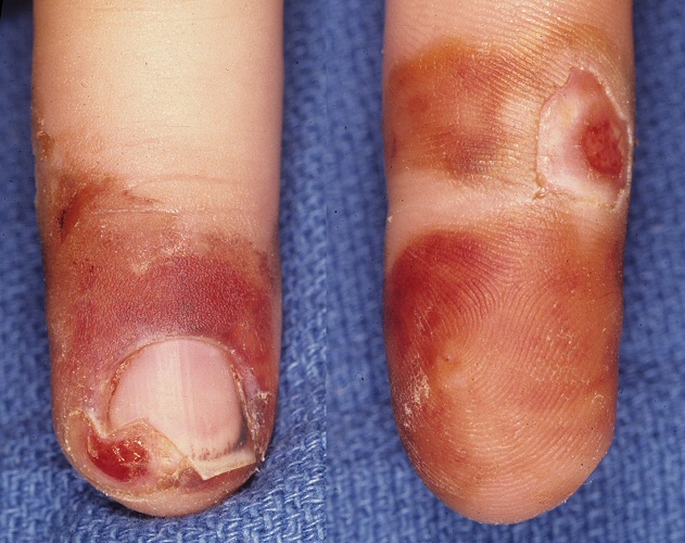 distal nail bed splinter hemorrhages and a palmar pressure ulcer at a fold in the dressing.