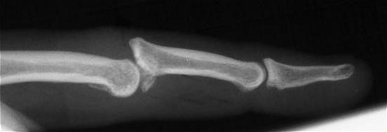 The most common type of middle phalanx base fracture is a small volar plate avulsion fracture, which commonly accompanies a sprain or dislocation of the proximal interphalangeal joint. This usually heals with a painless fibrous union. This injury requires no specific treatment other than what is indicated for the associated joint injury. Less common but much more troublesome are fracture-dislocations of the proximal interphalangeal joint. If the fracture line extends through the proper collateral ligament, the joint will become unstable, and the middle phalanx will displace with subluxation. Dorsal fracture-dislocations with a large palmar fragment are more common than volar fracture-dislocations. Either can be complicated by central articular impaction (Fig. 3). Treatment is controversial with advocates for internal or external fixation using a variety of techniques, including dynamic external traction, external fixation with distraction, internal fixation, and joint reconstruction with an osteochondral graft. Common principles include correction of subluxation, bone graft to correct impaction, and early motion.