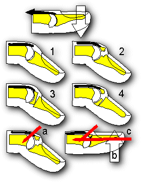 Fig. 17. Mallet finger. The usual injuring forces are active extension and passive flexion of the distal interphalangeal joint. (1.) Soft tissue mallet. (2.) Mallet fracture. (3, 4.) Pediatric Salter I and III mallet fractures. (a,b) Extension block technique for mallet fractures: a pin is placed not through, but just proximal to the fragment to lock it in position. The fracture is then reduced then secured with a second pin extending the distal phalanx |