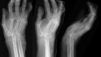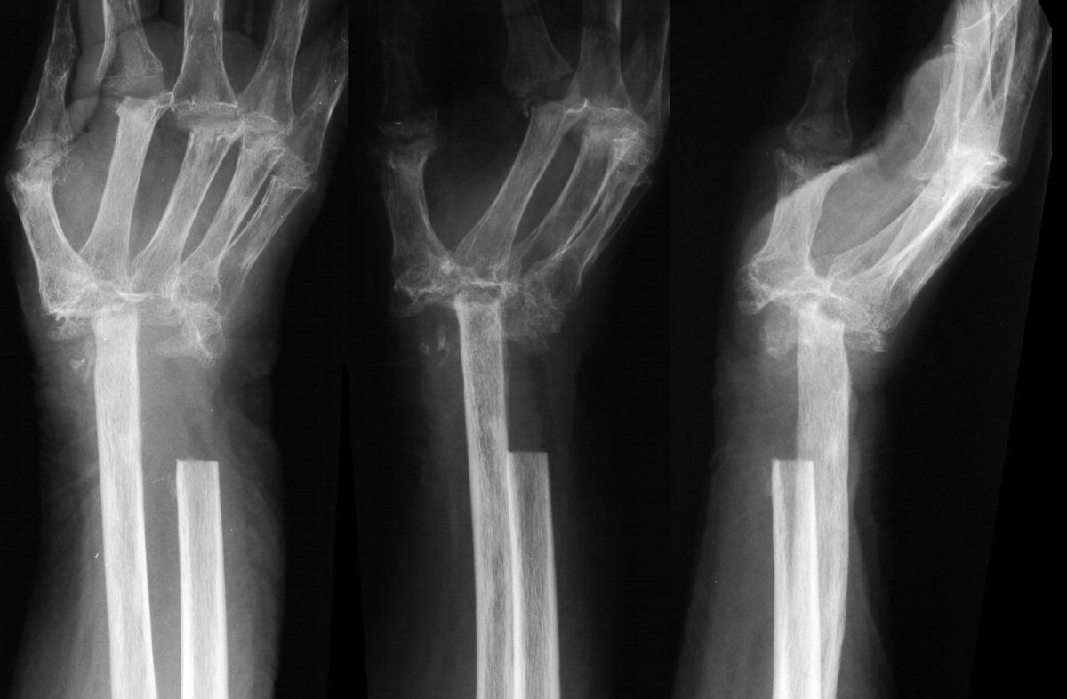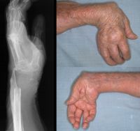 | This senior woman presented with wrist swelling. She had been previously managed elsewhere with a Swanson flexible wrist arthroplasty, complicated by infection, which was treated with implant removal. She had done well for the last four years, but recently had swelling and tenderness of the wrist. Xrays showed a flail wrist with radiometacarpal impingement: |