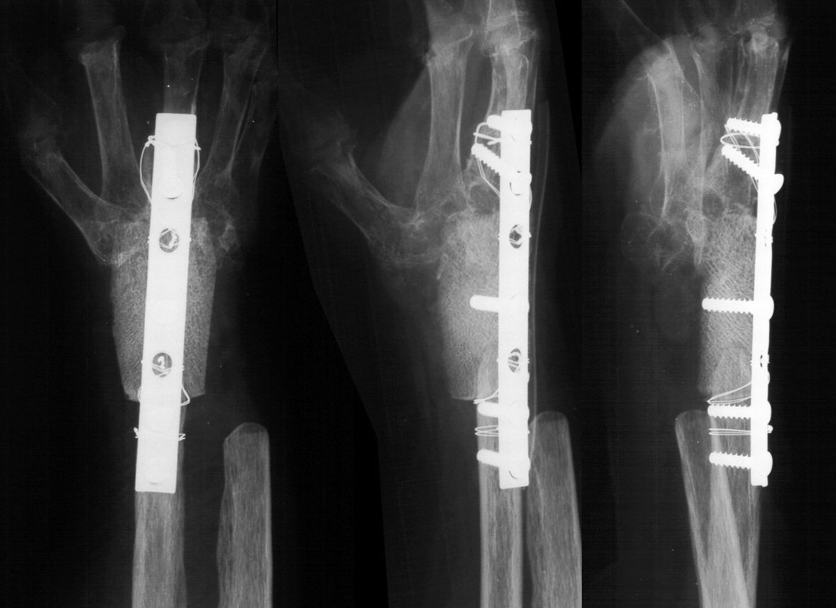 | She was treated with wrist arthodesis, using a sculpted fresh frozen femoral head allograft and a cerclage reinforced plate and screw fixation. |