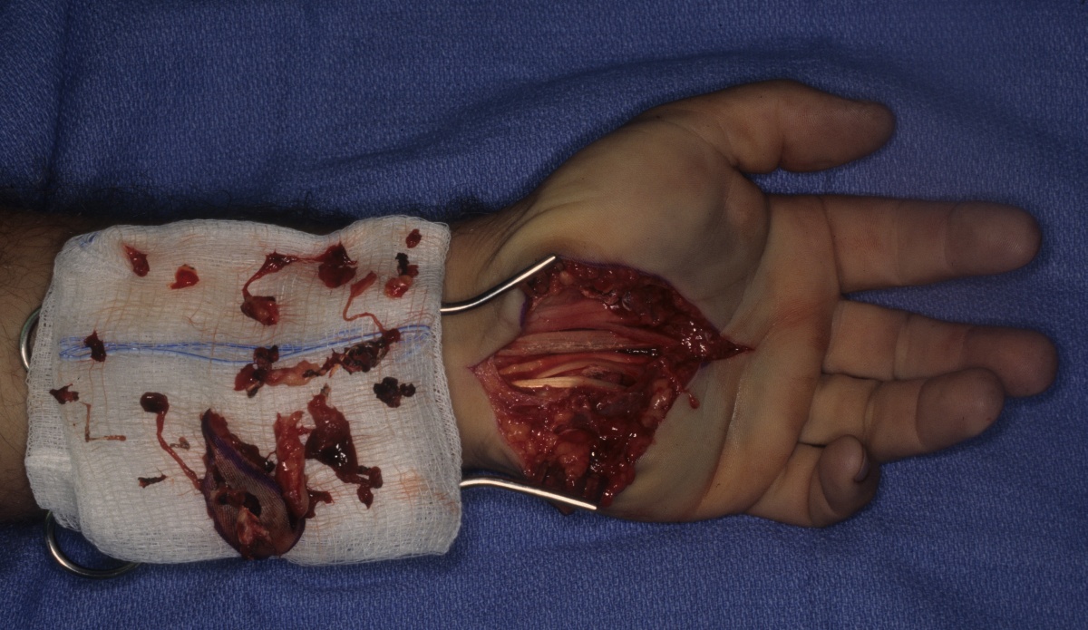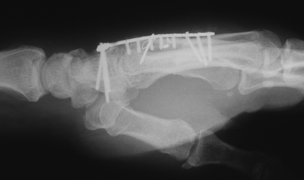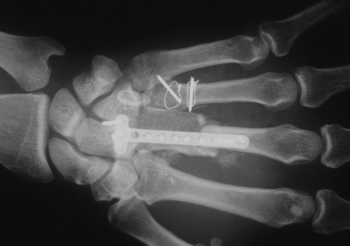 bone graft. This case followed the school of thought that because this was a low energy gunshot type injury, the zone of injury could be defined well enough to proceed with immediate reconstruction - fewest operations, fastest recovery, best chance of best possible final result. There are many other options, including delayed reconstruction. The fact that he had been spared significant nerve, vascular or tendon disruption made his chances of good result better than average regardless of the management path chosen. |