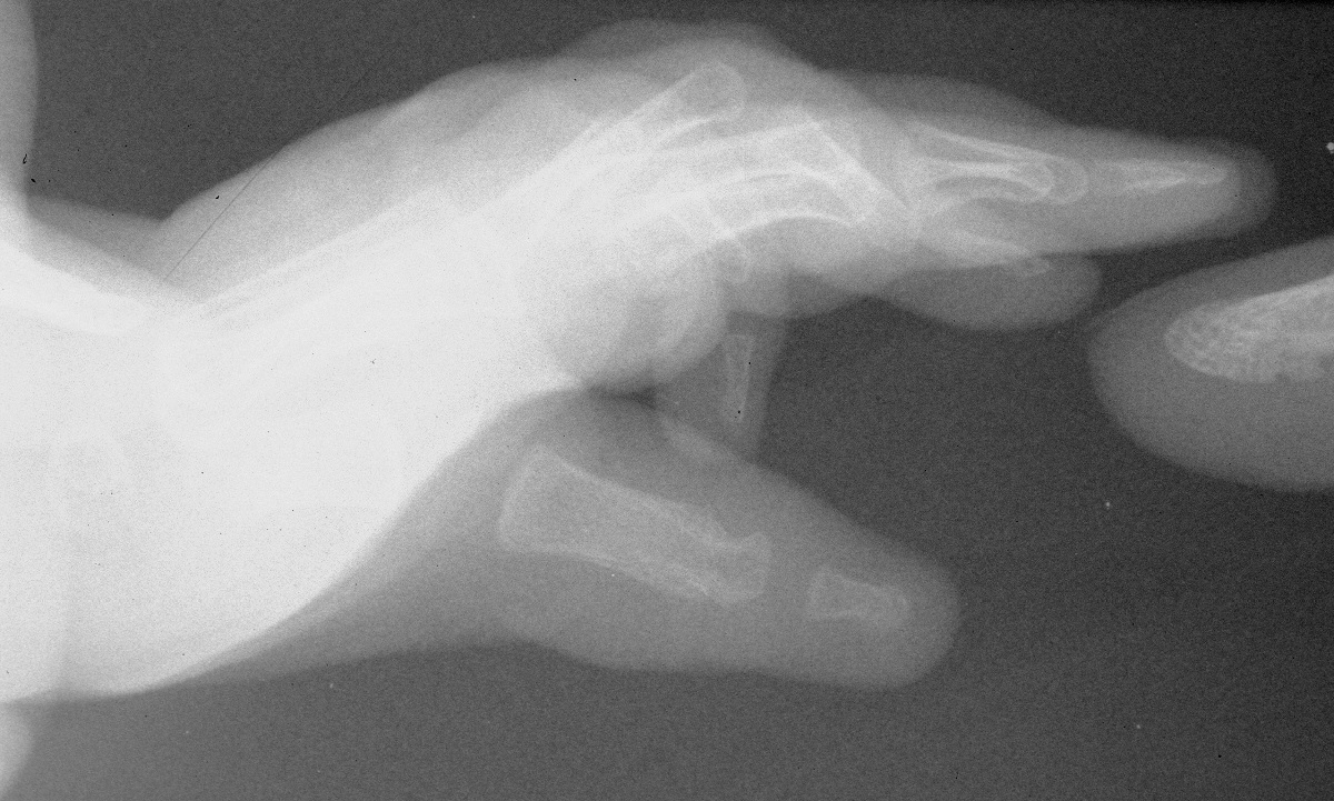 The same type of procedure was performed on both hands at the same setting. This included a shortening/straightening proximal interphalangeal joint fusion and a shortening/pronating/abducting metacarpal osteotomy, along with extensor tendon shortening. Bone fixation at each site was with an intramedullary absorbable pin and intraosseous PDS sutures. Red areas are the areas of skeletal removal.