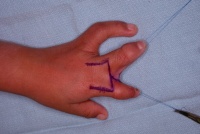 The procedures were staged. In the first procedure, the constriction ring syndactyly was taken down by splitting the skin bridge into dorsal and palmar  skin flaps. This removed the angular tethering force on the index finger and allowed maturation before the second procedures.