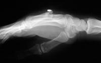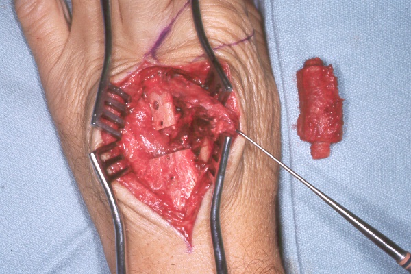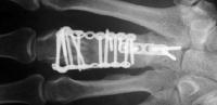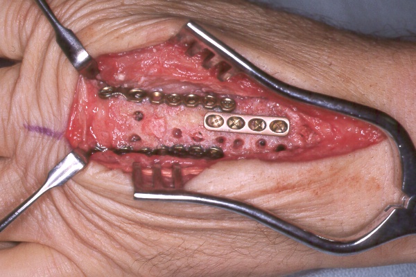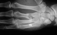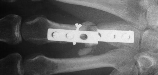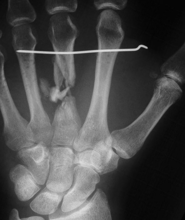 | Metacarpal fractures are common injuries. Metacarpal fracture nonunions are uncommon because of the support provided by adjacent metacarpals, but can be a difficult problem following high energy trauma. This series of pictures document the difficulty of treating a middle metacarpal nonunion following a gunshot injury. |