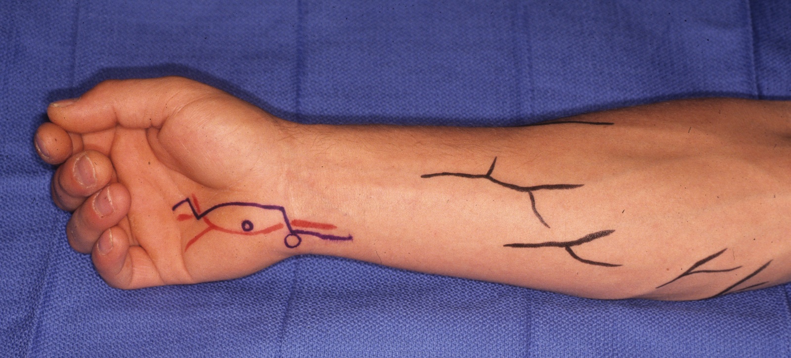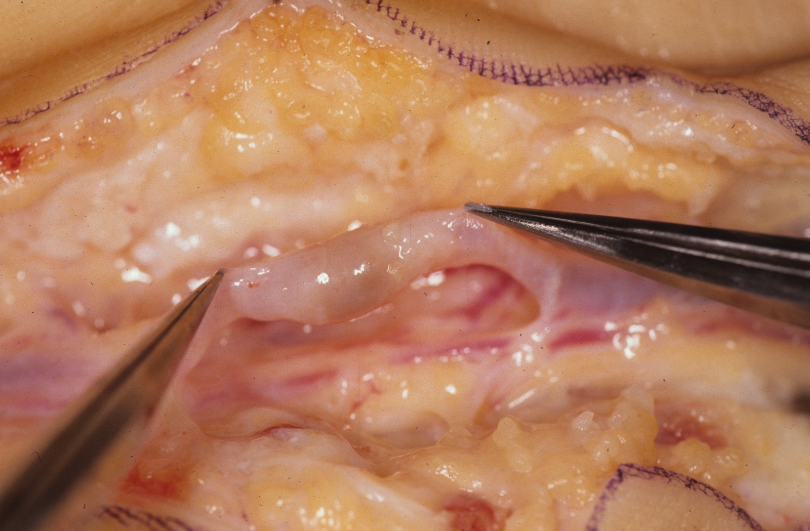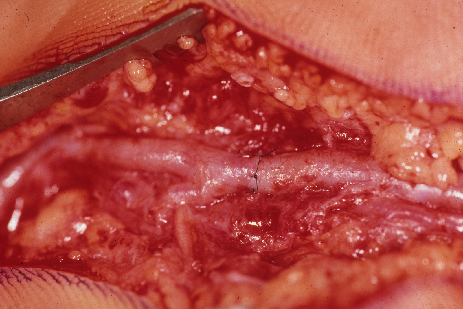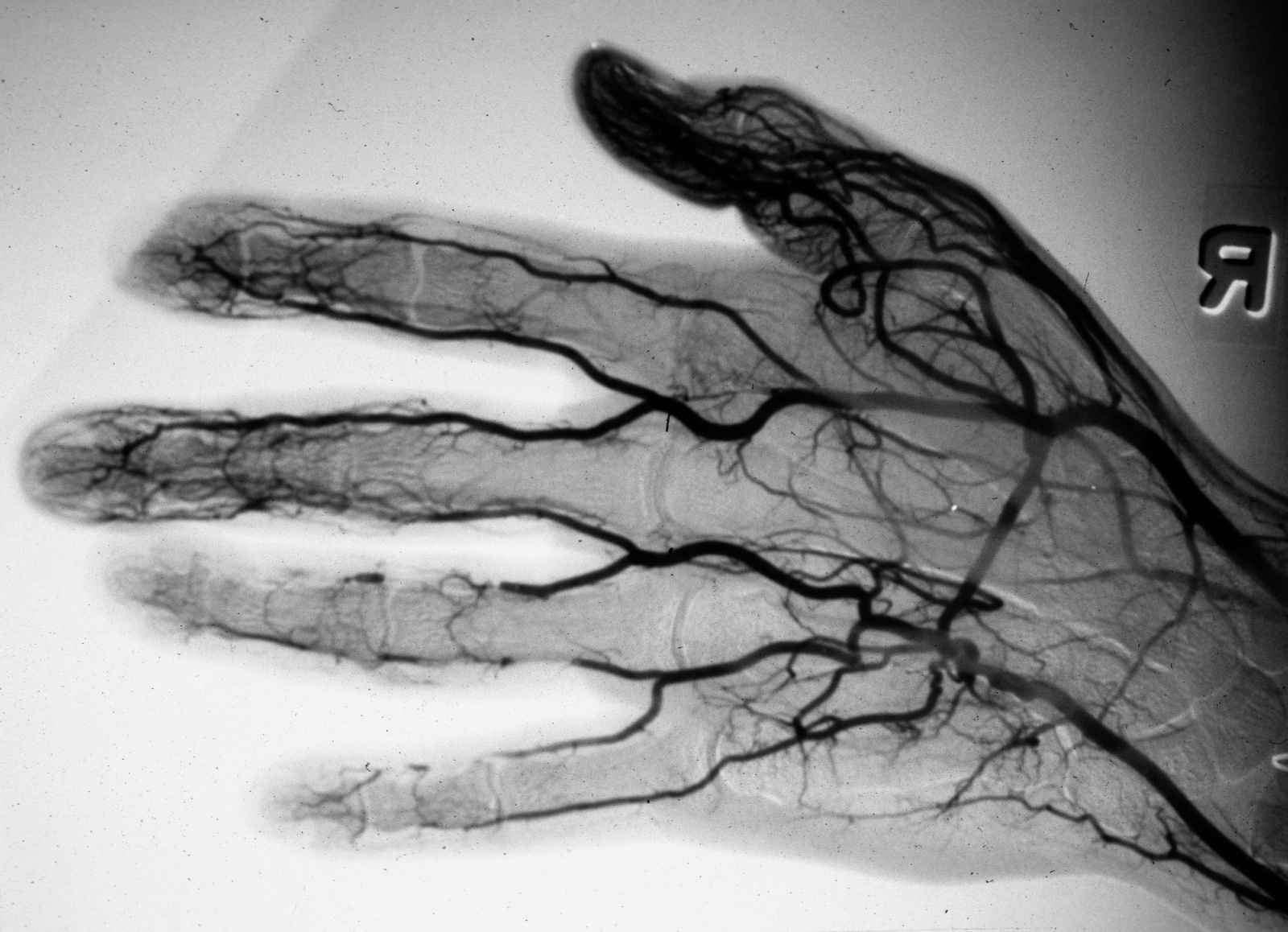 large arteries. The ulnar artery in the palm is prone to injury because it runs through the heel of the palm, an area which people lean on, push with, and hit (hypothenar hammer syndrome). An injured artery may form an aneurism containing blood clots which can break off, running downstream into the fingers, where they block blood flow and trigger blood vessel spasm. This is an example of such a situation, treated by removing the damaged arterial segment and repairing the ends to restore flow and prevent further emboli. |