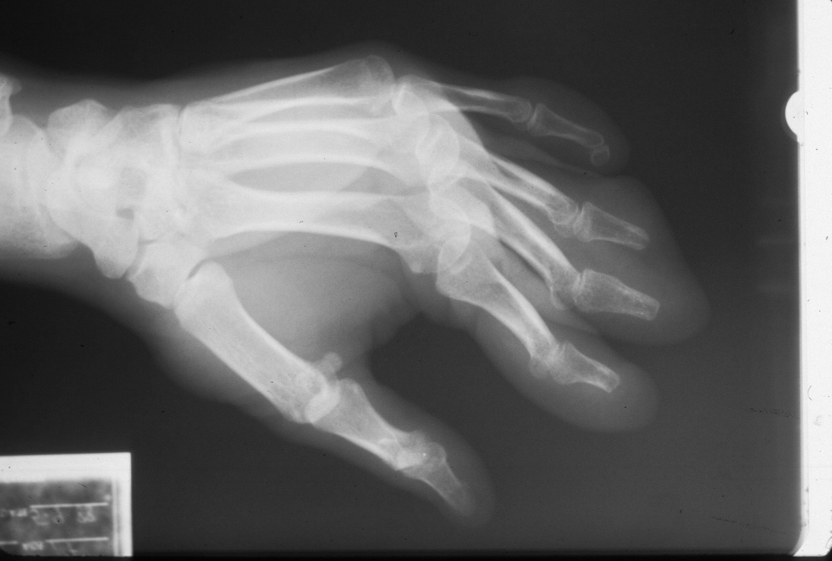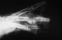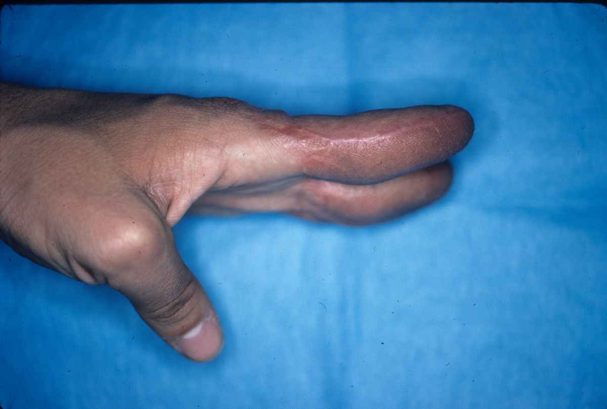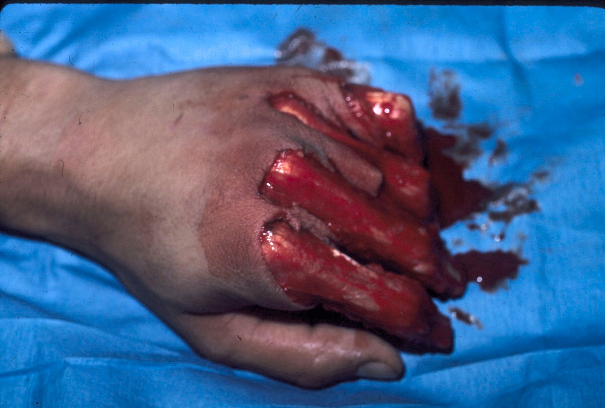 | Degloving injuries are commonly the result of industrial injuries involving high speed rollers or presses. Reconstruction is difficult because of the complexity of soft tissue loss. Skeletal elements maintain vascularity only to the most proximal phalanx distal to the most proximally degloved joint, and more distal phalanges should be discarded. This case demonstrates the first stages of reconstruction of a degloving injury of all fingers using a medial cross arm flap and temporary syndactyly within the flap. |