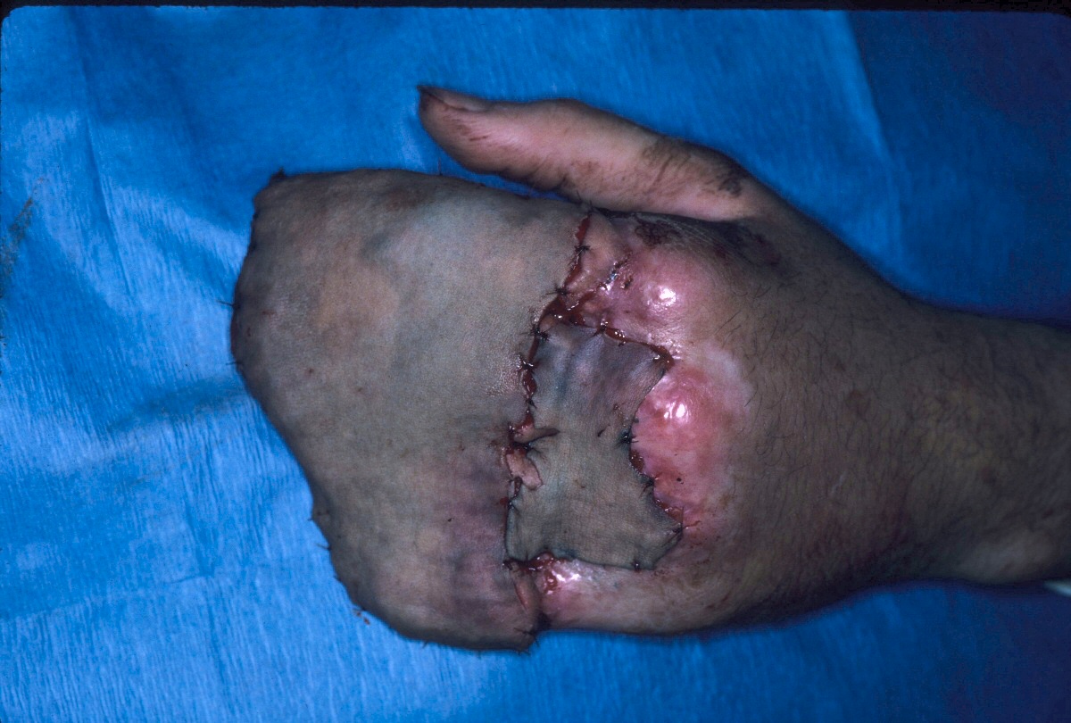 | The flap was delayed in stages and then divided. The donor site and dorsal hand were covered with split thickness skin grafts. |