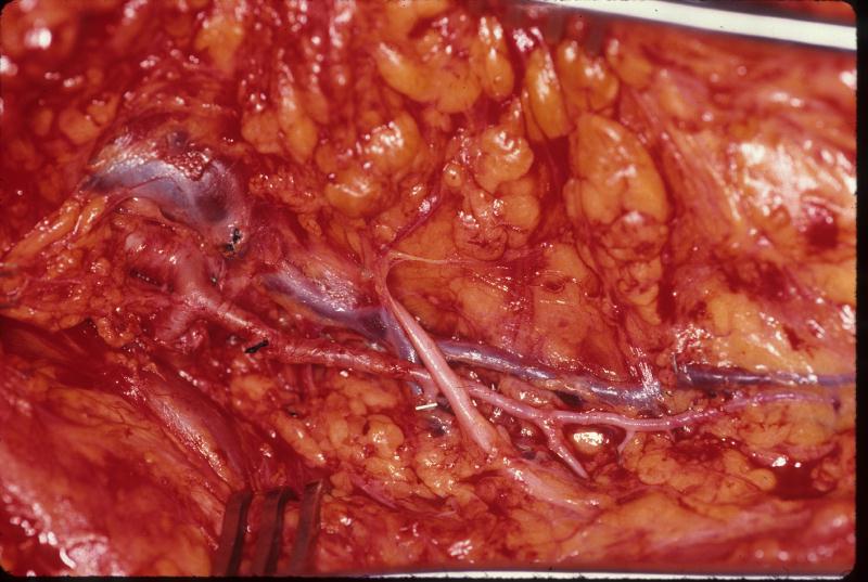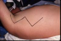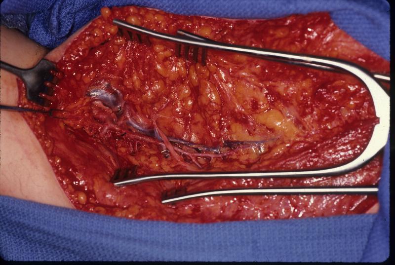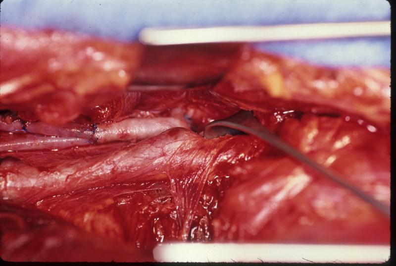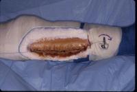 | This gentleman developed popliteal artery thrombosis after a closed knee dislocation and closed reduction. A segment of the subscapular arterial system was used to provide a small, tapering, branched arterial graft.