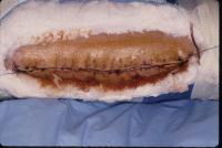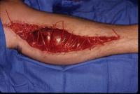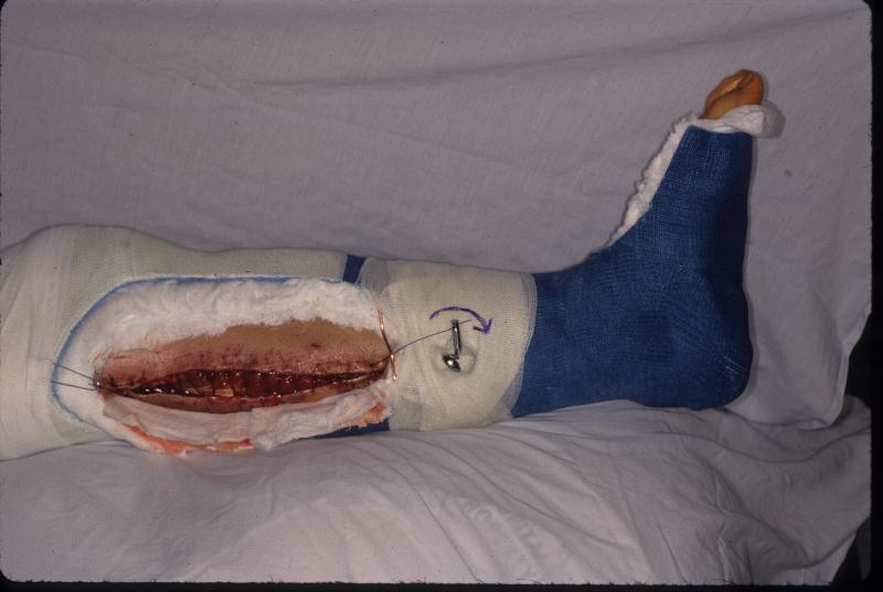 | Fasciotomy wound: initial attempts at progressive closure with staples and vessel loops were thwarted by repeated breaking of the elastics (below). |