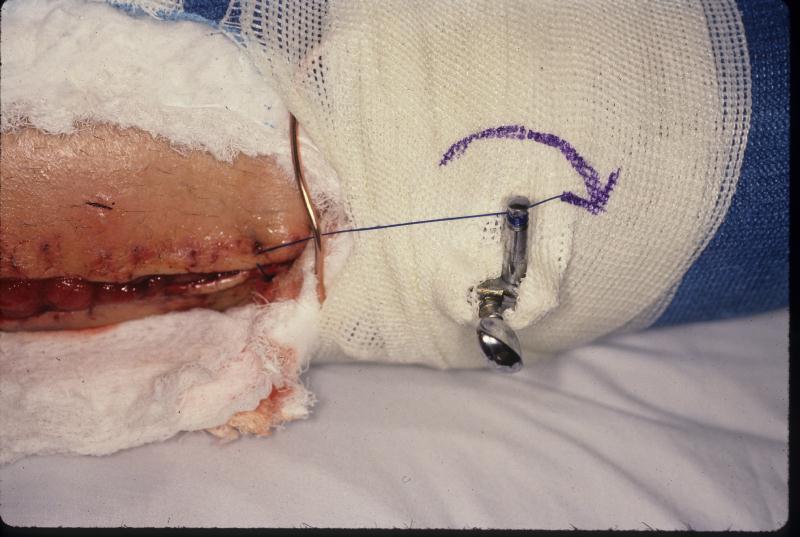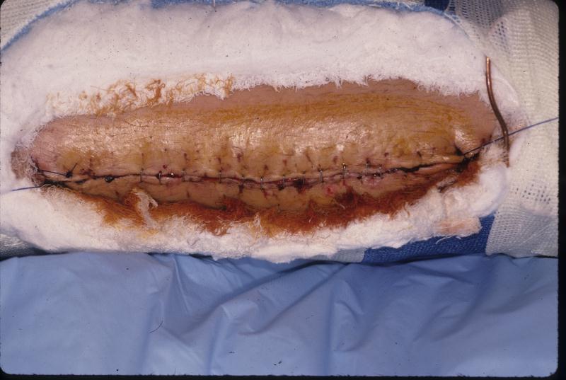 | After the patient had healed enough for casting, the wound was progressively closed with a running intradermal prolene attached to a banjo tuning peg which was tightened over the course of days. |