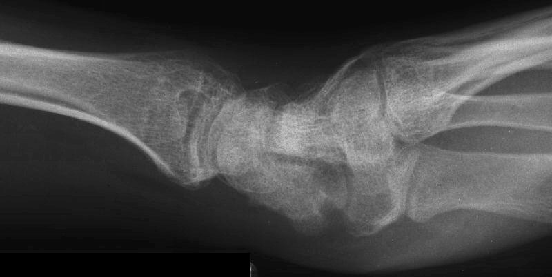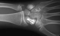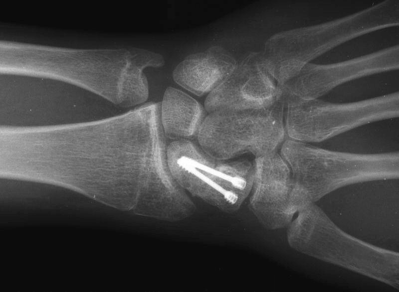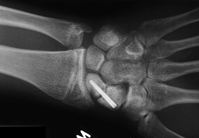 | This 19 year old had been treated elsewhere with an accutrac screw for a displaced scaphoid fracture. He was noncompliant with immobilization after surgery, and developed a painful nonunion. |