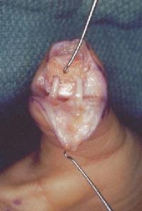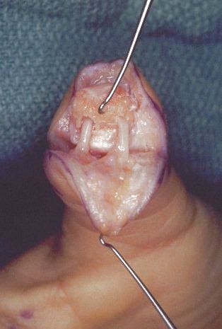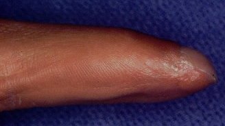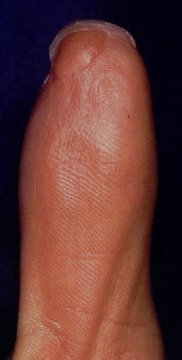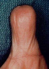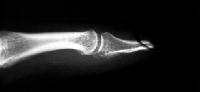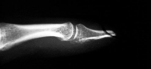 | Bone tip just beneath the skin, line on the film traces the thumbnail edge. |