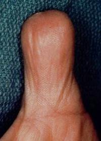 | This patient had a thumb tip avulsive amputation treated elsewhere with a V-Y advancement flap. There was inadequate soft tissue cover, terminal digital neuromas, poor vascularity of the tip, constant aching pain and persistent tenderness. Out of the variety of treatment options, including another try to add more skin to the tip with a flap, the patient chose amputation revision. |