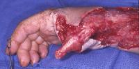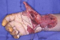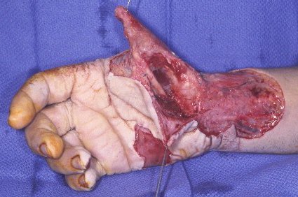 | High voltage electrical burn to the thumb and distal forearm. The distal thumb and thenar musles were burned beyond salvage. |