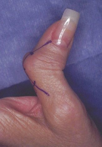 | Eponychial splitting incision allows access to the nodule, direct exposure of the neurovascular bundle and tailoring any skin excess. |