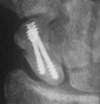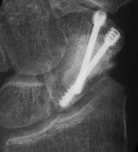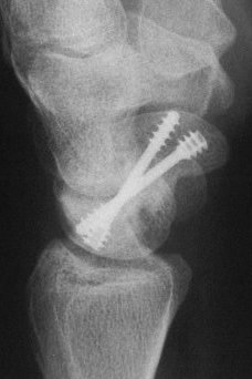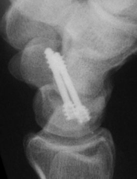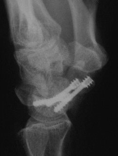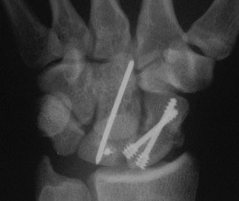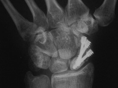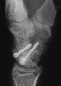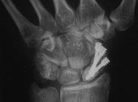 | Case 4. Nonunion with a graft and screws placed in both directions from a single palmar approach, hyperextending the wrist for the proximal entry... |