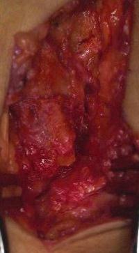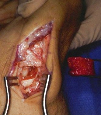 | Case 2. Nonunion with a large fracture cyst. After debridement, the defect, the graft, and yes, that is the capitate peeking through the defect. |