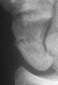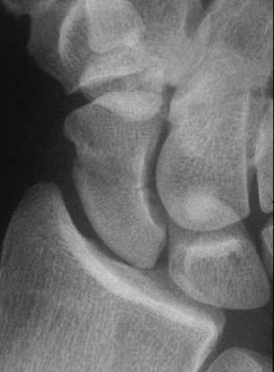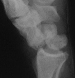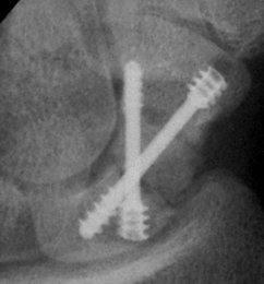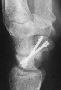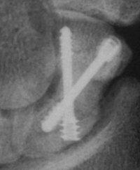 | One week after screw stabilization using a limited dorsal approach, he was back operating, but splinted when not scrubbed. These films are one month post op: no visible fracture. |