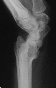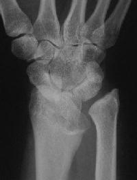 | Madelung's deformity is a dysplasia of the radius resulting in an exaggerated radial inclination, a short forearm, dorsal dislocation of the ulnar head and a "V" shaped proximal carpal row. It may be painful and may result in extensor tendon rupture. Congenital Madelungs may be due to an abnormal fibrous band tethering sigmoid notch of the radius proximally to the ulna. Traumatic Madelung's may follow partial growth arrest of the distal radius. Treatment options differ in the mature and immature skeleton. |