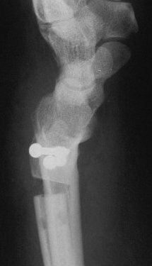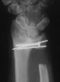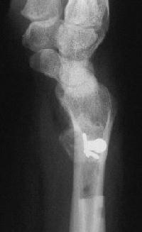 | And postop: Here, an inadequate ulnar gap led to heterotopic bone formation which almost resulted in a pseudarthrosis. |