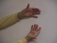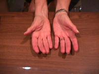 | Typical posture of adducted thumbs, swelling more obvious on the patient's left hand. |