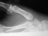 | Same thumb after surgery, the reconstructed joint visible as an even space around the metacarpal base. |
