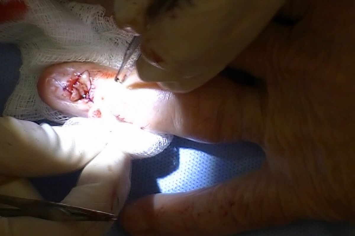 Video captures of excision and skin grafting of germinal matrix only. An eponychial splitting incision was used; an ellipse of skin graft was taken from the dorsolateral middle phalanx skin in continuity with this incision.