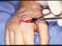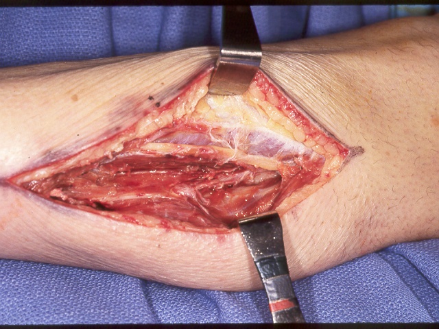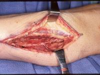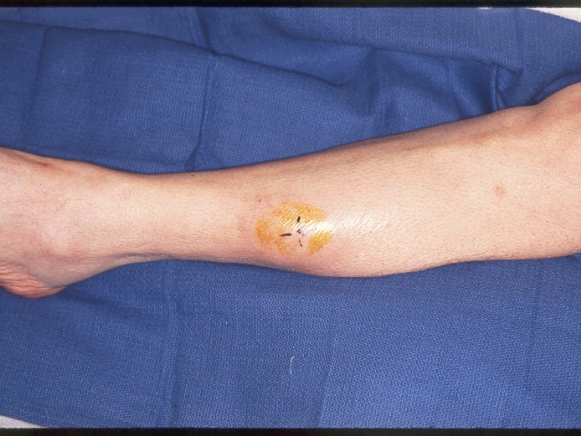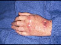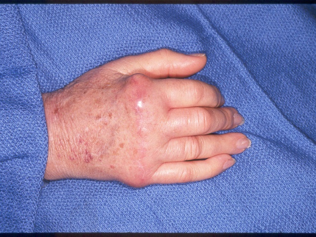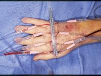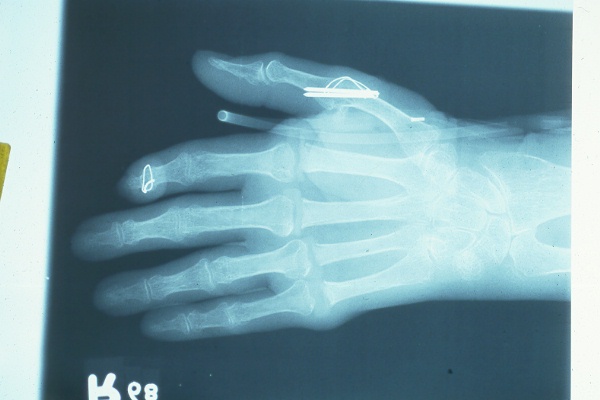 | Infections seeding implants are uncommon. In this case, a patient with rheumatoid arthritis and silastic metacarpophalangeal joint replacements developed infections of her implants associated with a calf abscess developing from a puncture wound of the sole of the foot. This patient had the implant surgery done elsewhere, and had done well for several years until a few weeks after she stepped on something sharp and developed a minor infection in the foot, which her doctor treated with antibiotics. Weeks later, she developed swelling, redness, and worsening pain in all of her hand joint replacements. |