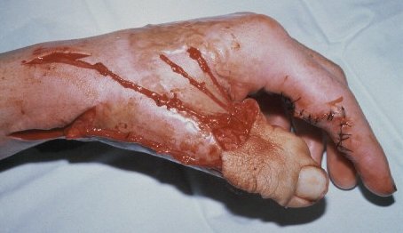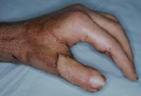 | Preoperative appearance following avulsion and skin graft a partial thumb amputation: The skin graft skin cover is inadequate: tight, no padding, not durable, insensate. |