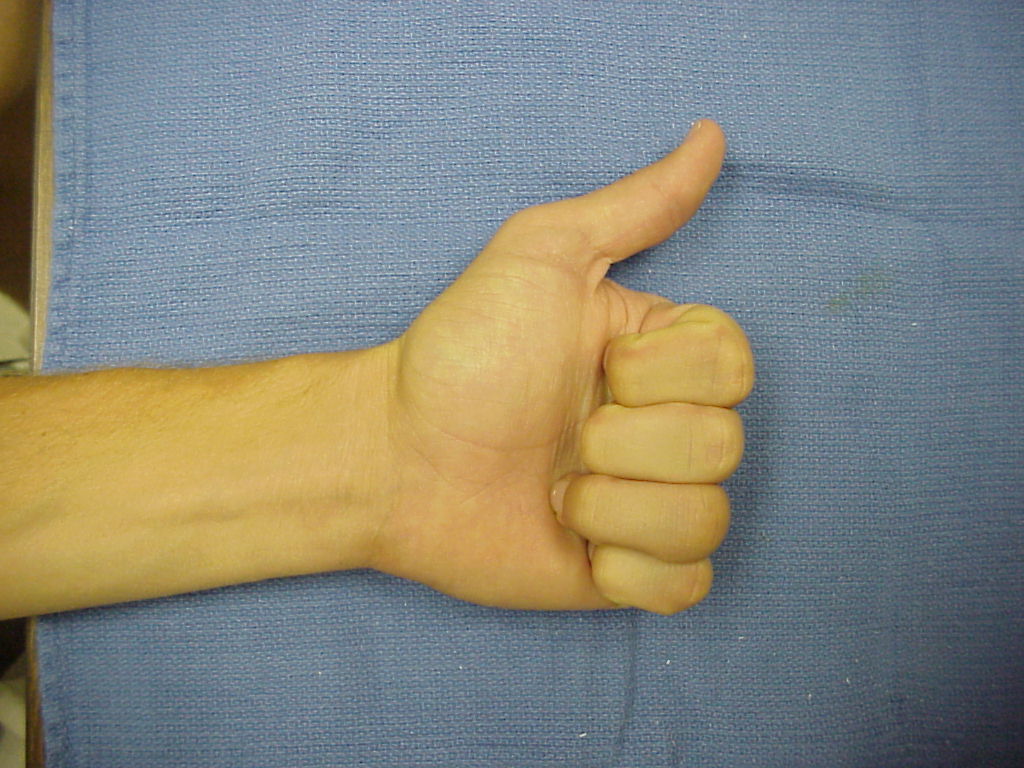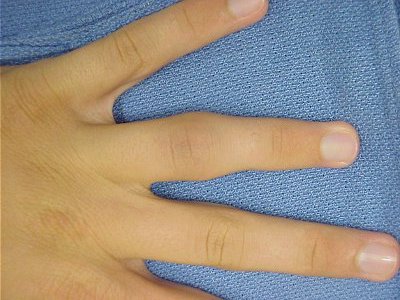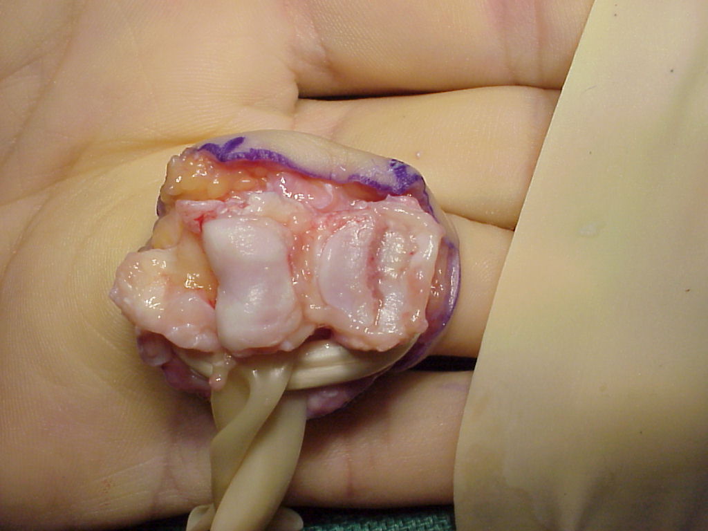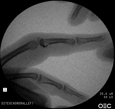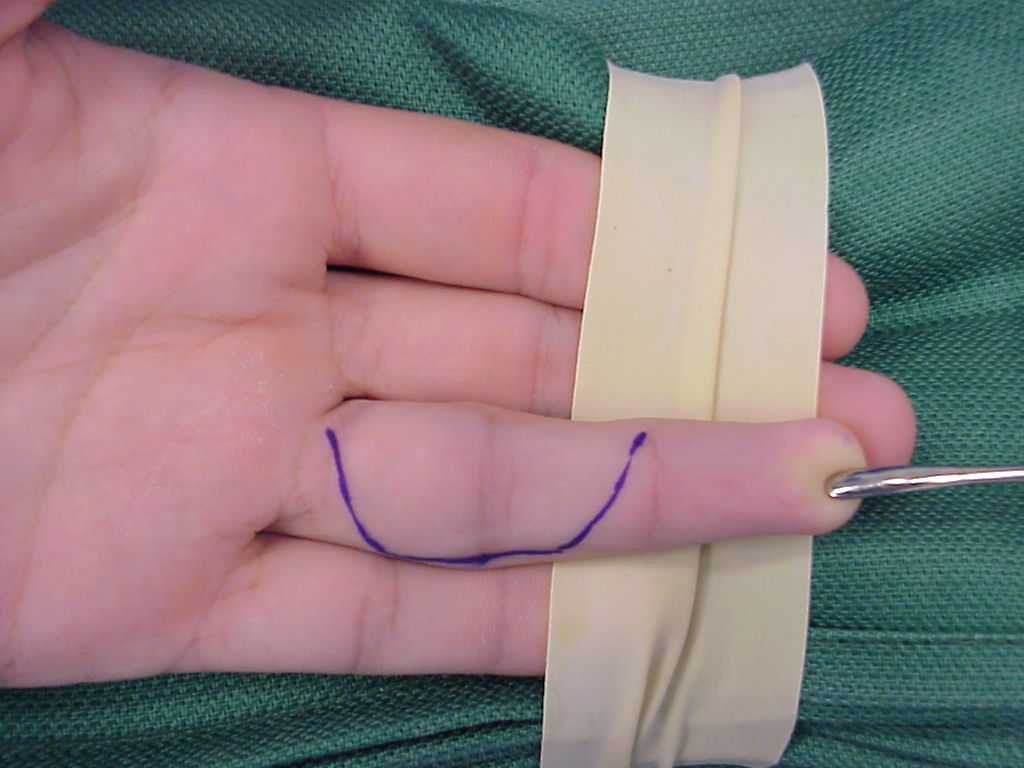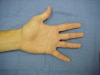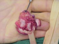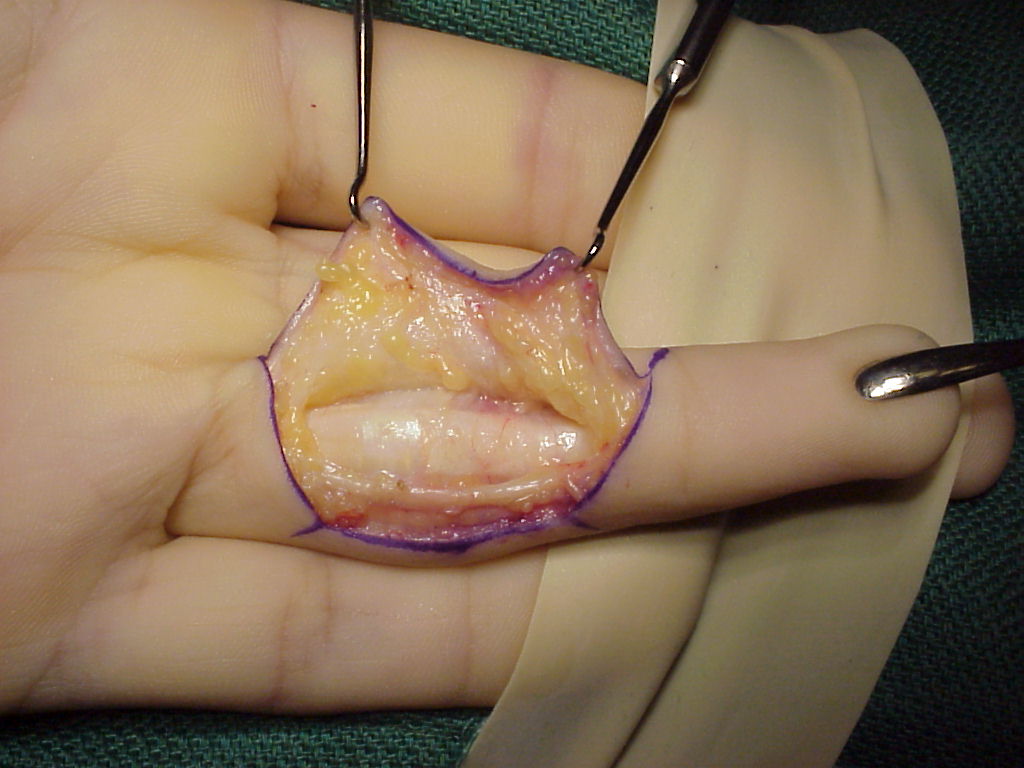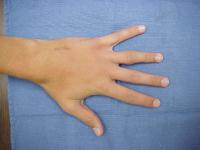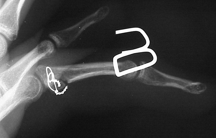 | Shotgun view of the pathology: the dorsal half of the base of the middle phalanx appears preserved, the palmar half recessed and covered with scar: |