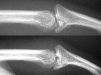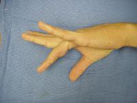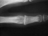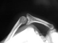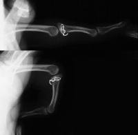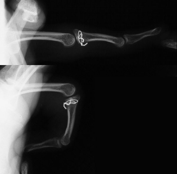 | Xrays show an apparently healed PIP fracture dislocation with dorsal subluxation - but concentric tracking of the abnormal palmar articulation. |