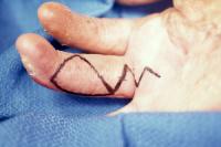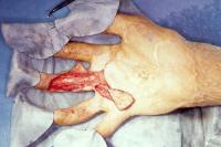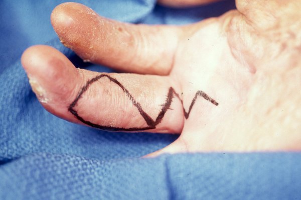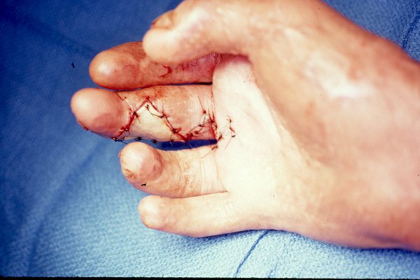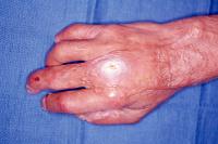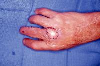 | This gentleman had a chronic recurring ulceration over the dorsal aspect of the middle finger metacarpal head after treatment for extensive burn injuries. Because of the limited availability of dorsal skin flap donor sites, the area in question was resurfaced using a digital artery island flap from the same finger. |