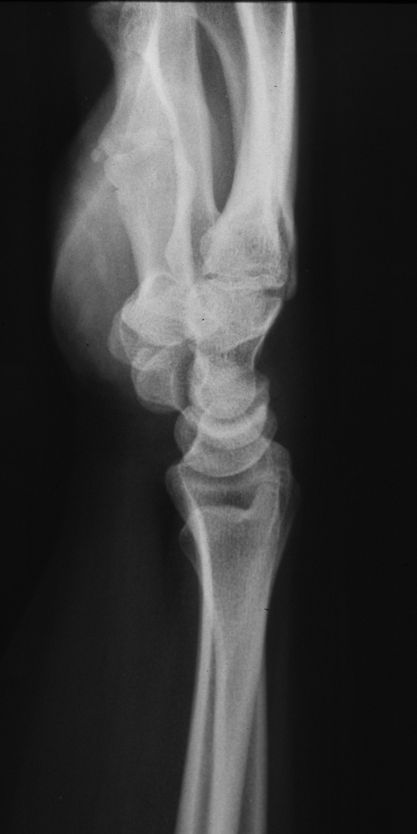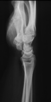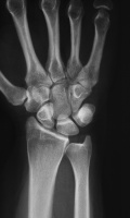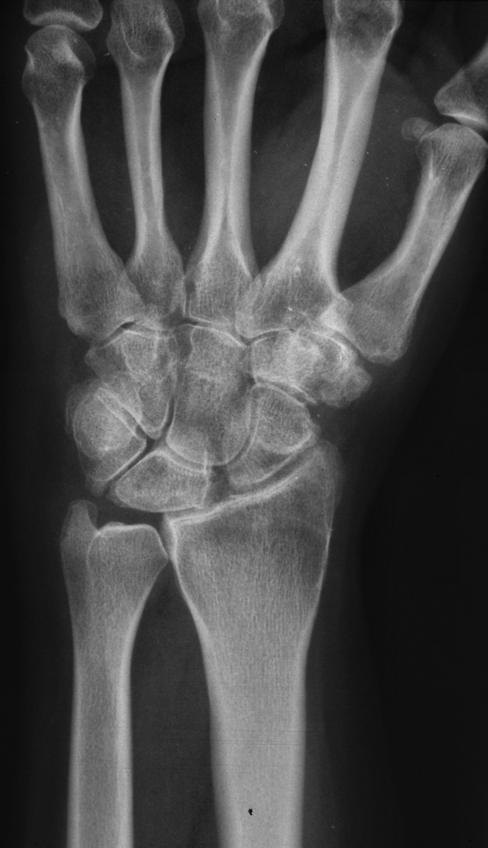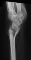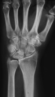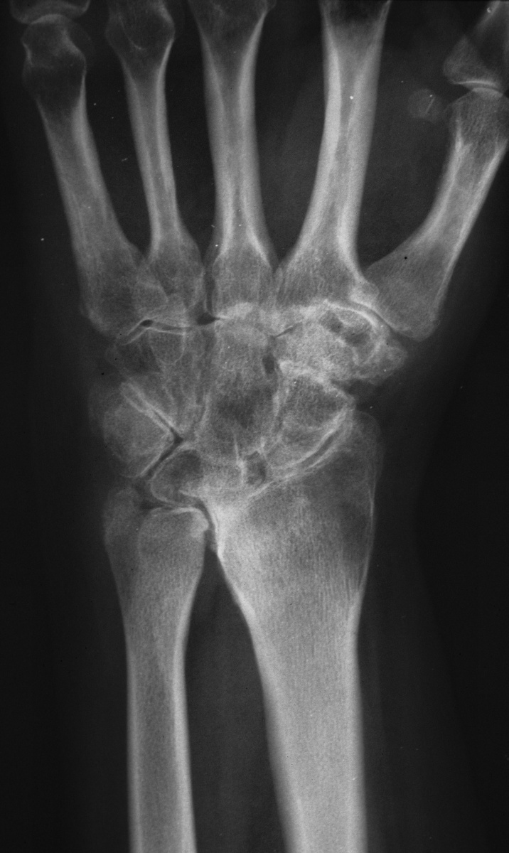 | This woman in her 30's presented with left wrist pain and was found to have inflammatory osteoarthritic changes throughout her wrist, distal radioulnar joint and thumb basal joint. Blood tests were normal, including rheumatoid factor, antinuclear antibody, sedimentation rate, uric acid, and complete blood count. She was treated with nonsteroidal oral antiinflammatory medication and splints. |