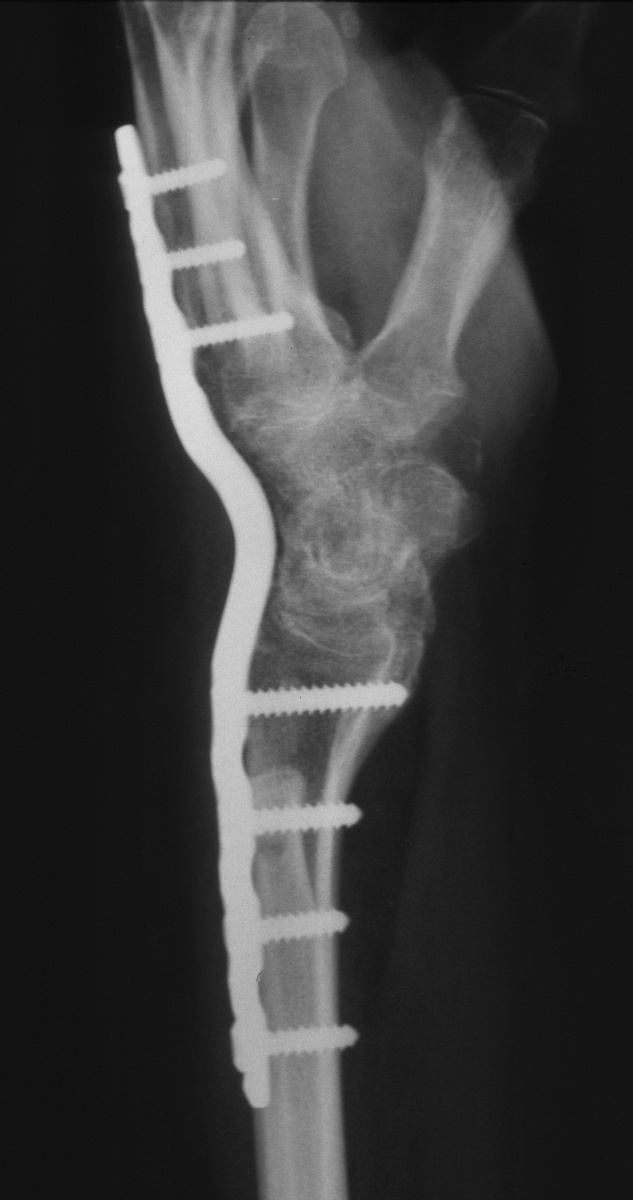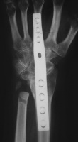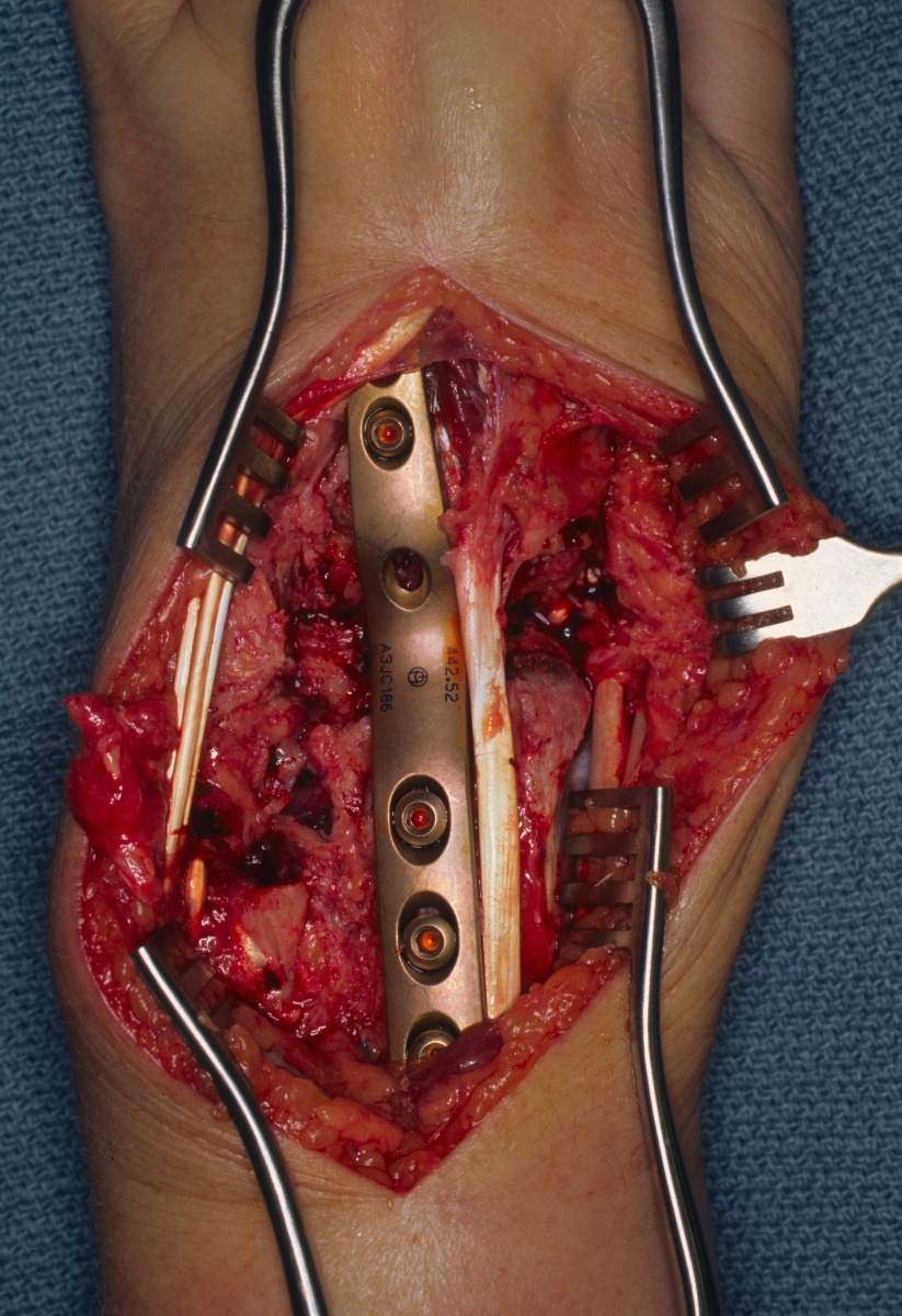 | Eventually, she was treated with wrist fusion, distal ulnar resection and extensor carpi ulnaris tenodesis, and basal joint excision arthroplasty with split abductor pollicis longus anchovie interposition and ligament reconstruction - all through a single dorsal approach.: |