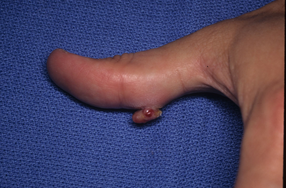 | Case 5 Prominent fingertip pyogenic granuloma. |