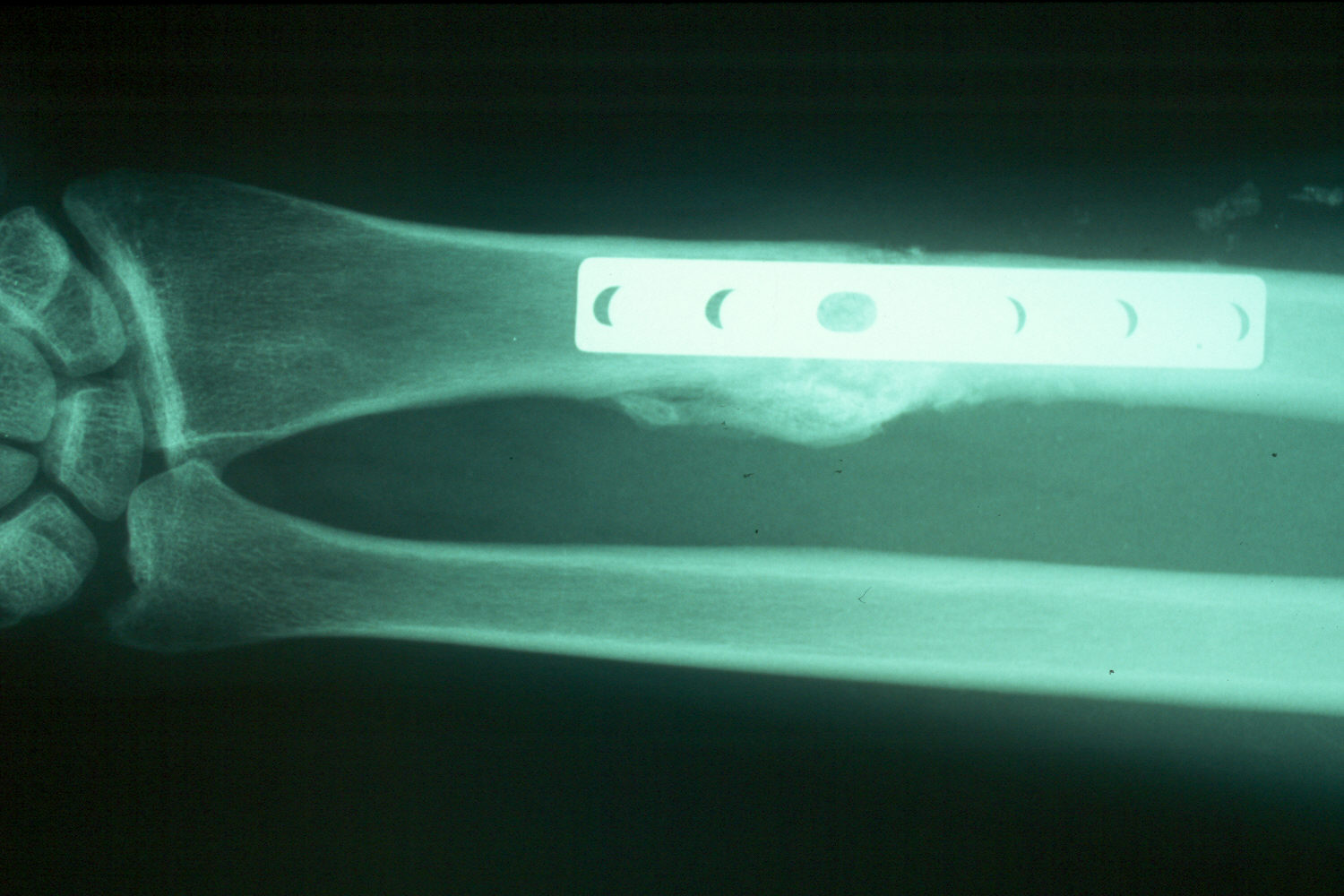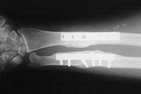 | Initial films show a displaced radial shaft fracture and distal dislocation of the distal radial ulnar joint. |