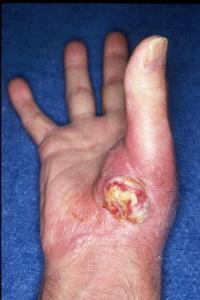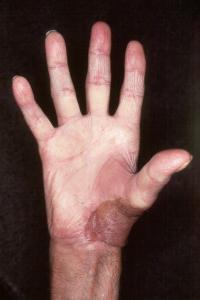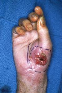 | This elderly gentleman with lung cancer developed a thenar area metastasis. It did not respond to radiotherapy, was painful and foul smelling. |