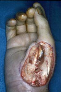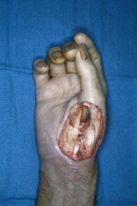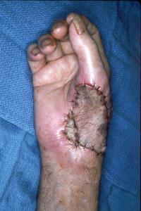 | Flap inset. A small full thickness graft was used in the central palm. |