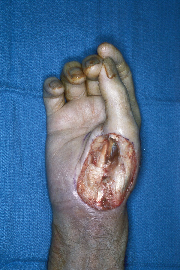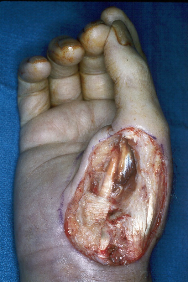 | Thenar muscles excised. Flexor pollicis longus, flexor carpi radialis and abductor pollicis longus, transverse retinacular ligament and thumb metacarpal are exposed. |