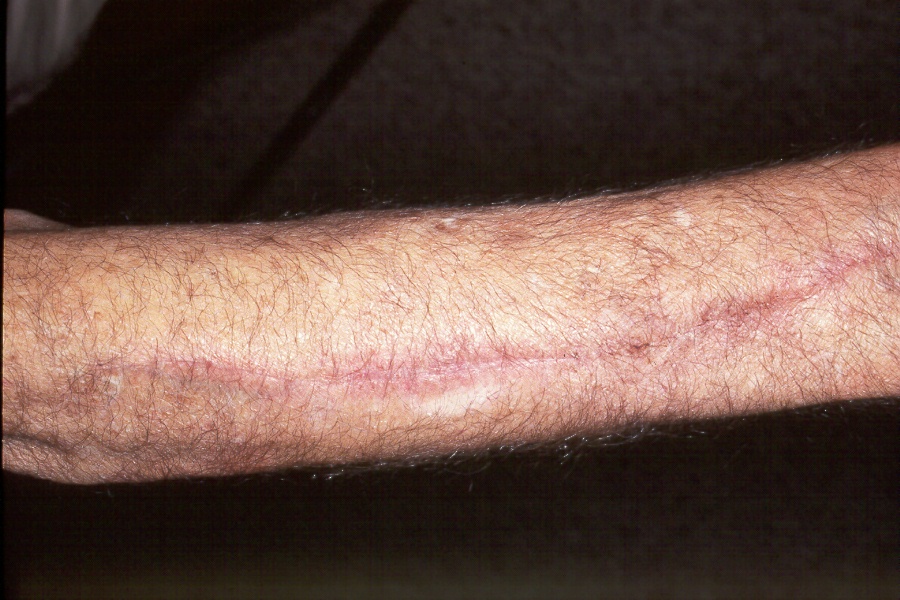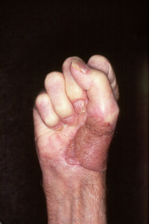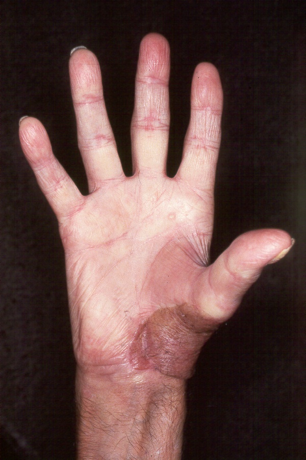 | Six weeks postoperative, healed and pain free. There were no hand recurrences during the patient's remaining nine months of life. |