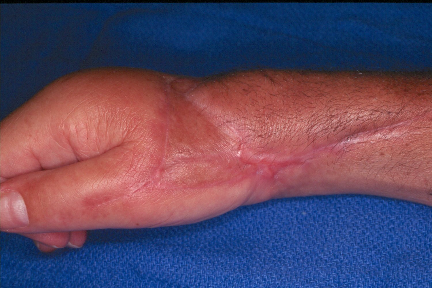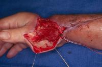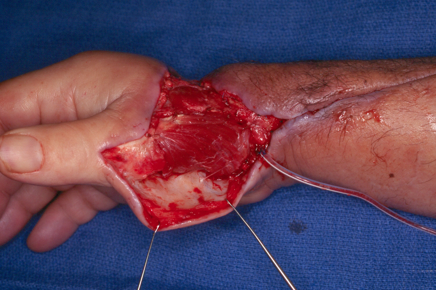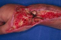 | Appearance of the wrist and thumb after multiple debridements for progressive infected wound necrosis following failed radiocephalic shunt construction. The radial artery has been ligated. |