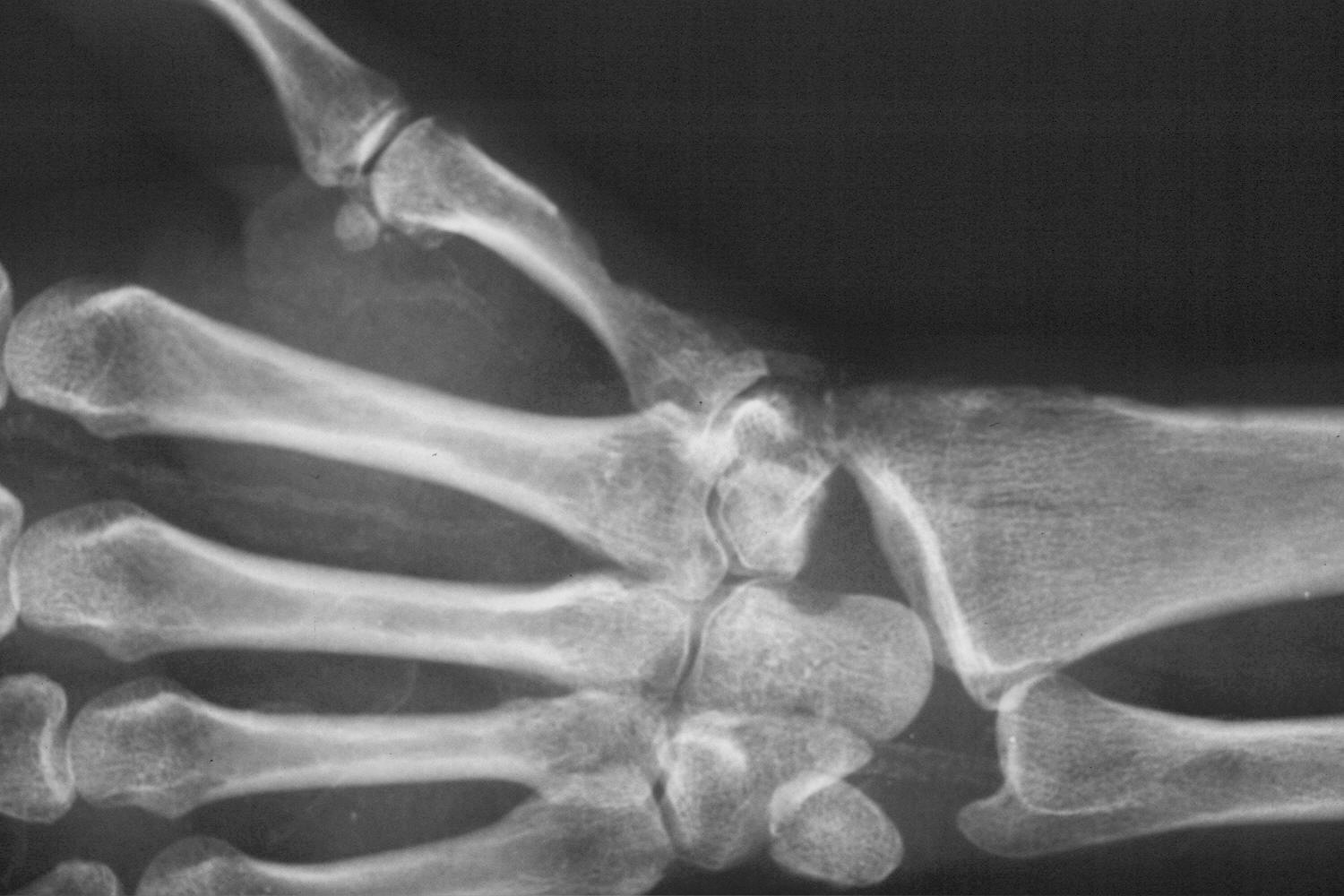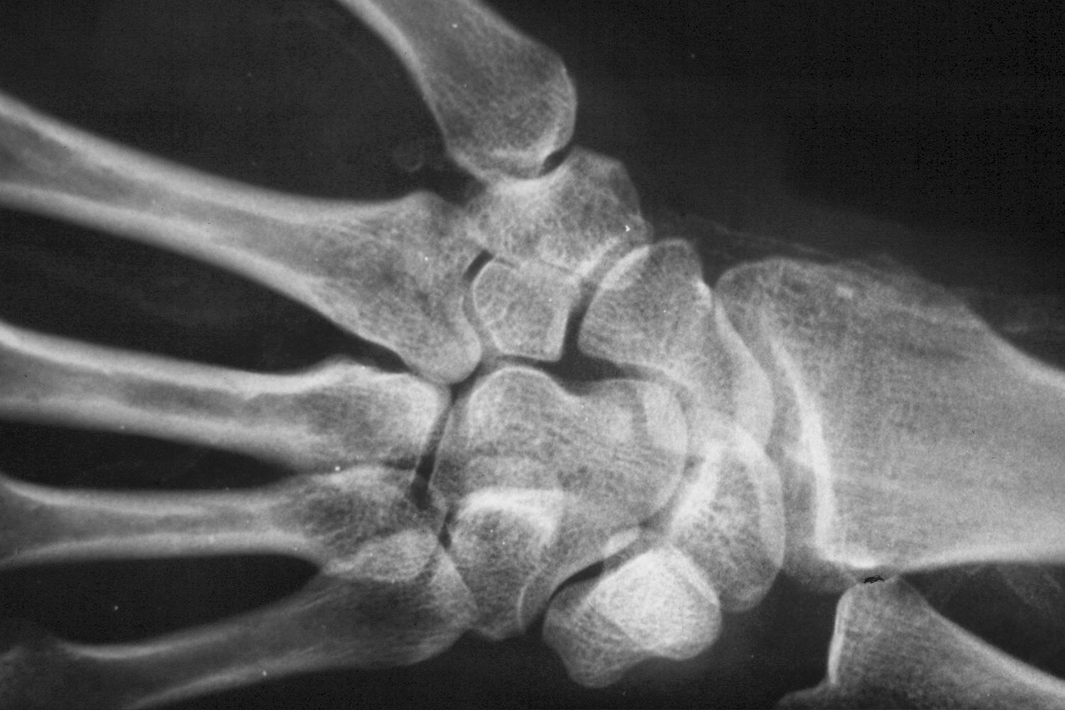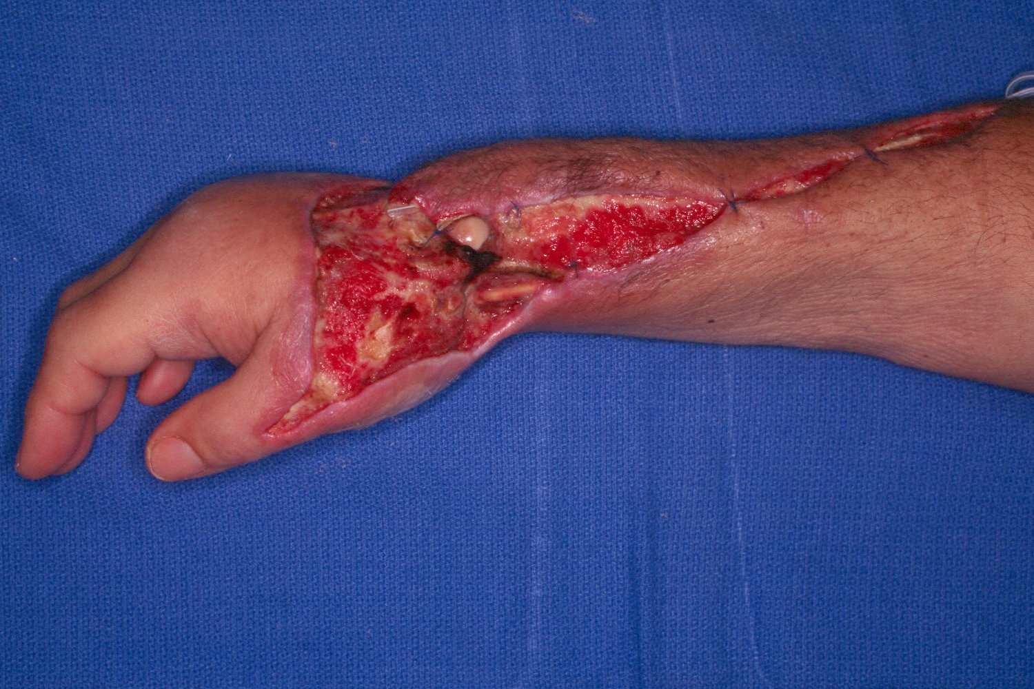 | By this point, the patient has undergone proximal row carpectomy for control of infection involving the scaphoid and lunate. The capitate is visible in the depths of the wound: |